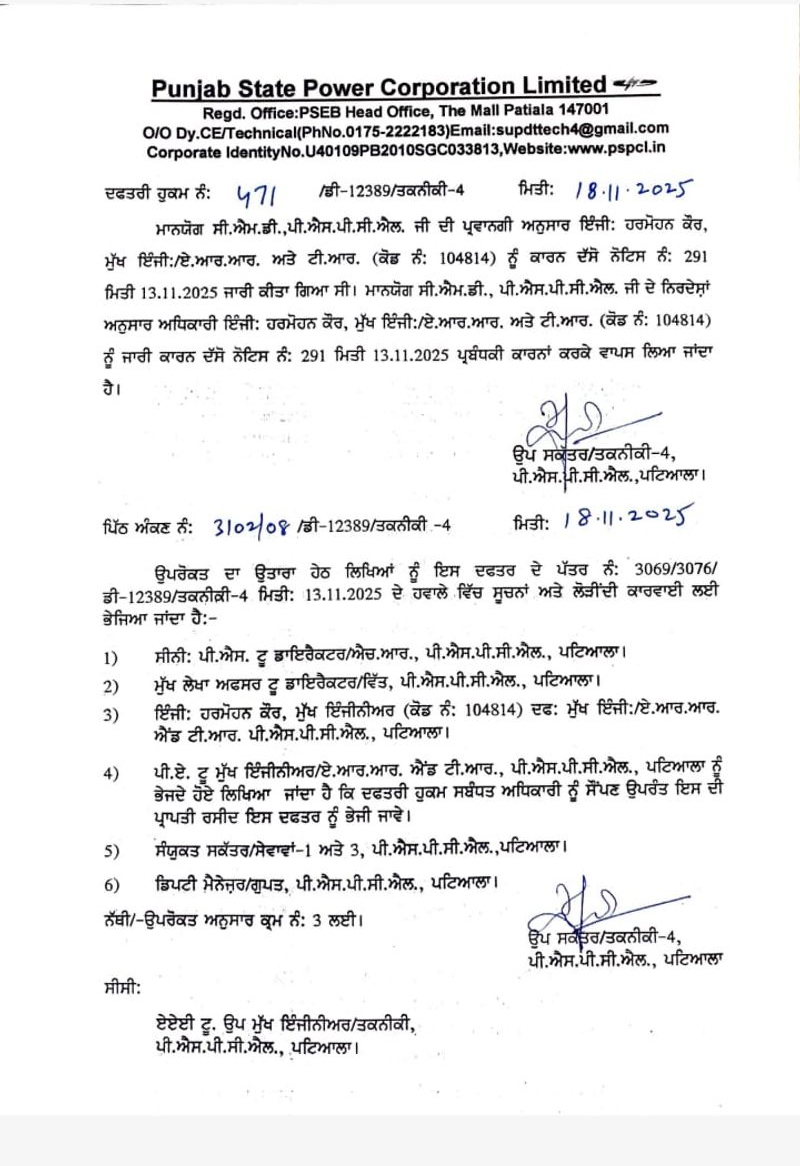 ਜ਼ਿਕਰਯੋਗ ਹੈ ਕਿ ਚੀਫ ਇੰਜਨੀਅਰ ਹਰਮੋਹਨ ਕੌਰ ਨੇ ਚਾਰ ਨਵੰਬਰ ਨੂੰ ਨਗਰ ਕੀਰਤਨ ਸਬੰਧੀ ਛੁੱਟੀ ਲਈ ਸੀ ਜਿਸ ਤੋਂ ਬਾਅਦ ਉਨ੍ਹਾਂ ਨੇ ਕਿਸੇ ਹੋਰ ਕਾਰਜ ਲਈ ਆਪਣੀ ਛੁੱਟੀ ਵਧਾਉਣ ਲਈ ਅਰਜ਼ੀ ਭੇਜੀ ਪਰੰਤੂ ਛੁੱਟੀ ਨਾ ਵਧਾਉਂਦਿਆਂ ਮੈਨੇਜਮੈਂਟ ਨੇ ਉਨ੍ਹਾਂ ਨੂੰ ਕਾਰਨ ਦੱਸੋ ਨੋਟਿਸ ਜਾਰੀ ਕਰ ਦਿੱਤਾ ਜਿਸ ਵਿੱਚ ਤਰਕ ਦਿੱਤਾ ਗਿਆ ਕਿ ਇਨ੍ਹਾਂ ਦਿਨਾਂ ਵਿੱਚ ਉਨ੍ਹਾਂ ਨੇ ਕੁਝ ਜ਼ਰੂਰੀ ਮੀਟਿੰਗਾਂ ਵਿੱਚ ਸ਼ਾਮਿਲ ਹੋਣਾ ਸੀ ਪਰ ਉਹ ਅਜਿਹਾ ਨਹੀਂ ਕਰ ਸਕੇ ਜਿਸ ਕਾਰਨ ਉਨ੍ਹਾਂ ਨੂੰ ਕਾਰਨ ਦੱਸੋ ਨੋਟਿਸ ਜਾਰੀ ਕੀਤਾ ਗਿਆ। ਉਧਰ ਇੰਜਨੀਅਰ ਐਸੋਸੀਏਸ਼ਨ ਦੇ ਜਨਰਲ ਸਕੱਤਰ ਸ੍ਰੀ ਅਟਵਾਲ ਦਾ ਕਹਿਣਾ ਸੀ ਕਿ ਪਾਵਰਕੌਮ ਮੈਨੇਜਮੈਂਟ ਵੱਲੋਂ ਲਗਾਤਾਰ ਇੰਜਨੀਅਰਾਂ ਖਿਲਾਫ ਵਧੀਕੀਆਂ ਕੀਤੀਆਂ ਜਾ ਰਹੀਆਂ ਹਨ। ਪਹਿਲਾਂ ਇੱਕ ਡਾਇਰੈਕਟਰ ‘ਤੇ ਕਥਿਤ ਝੂਠੇ ਦੋਸ਼ ਲਾ ਕੇ ਉਸ ਨੂੰ ਹਟਾ ਦਿੱਤਾ ਗਿਆ ਤੇ ਫਿਰ ਇੱਕ ਚੀਫ ਇੰਜਨੀਅਰ ਨੂੰ ਵੀ ਕਥਿਤ ਝੂਠੇ ਦੋਸ਼ਾਂ ਤਹਿਤ ਮੁਅੱਤਲ ਕੀਤਾ ਗਿਆ ਹੈ। ਇੰਜਨੀਅਰ ਐਸੋਸੀਏਸ਼ਨ ਨੇ ਚਿਤਾਵਨੀ ਦਿੱਤੀ ਹੈ ਕਿ ਜੇਕਰ ਭਵਿੱਖ ਵਿੱਚ ਵੀ ਮੈਨੇਜਮੈਂਟ ਨੇ ਅਜਿਹੀਆਂ ਸਰਗਰਮੀਆਂ ਜਾਰੀ ਰੱਖੀਆਂ ਤਾਂ ਉਹ ਆਰ ਪਾਰ ਦੀ ਲੜਾਈ ਲੜਨ ਲਈ ਮਜਬੂਰ ਹੋਣਗੇ।