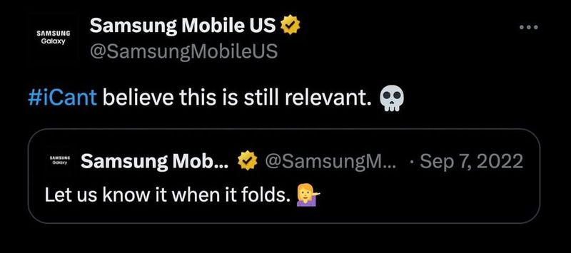ਇੱਕ ਹੋਰ ਟਵੀਟ ਵਿੱਚ ਸੈਮਸੰਗ ਨੇ ਆਪਣੇ ਪੁਰਾਣੇ ਟਵੀਟ ਨੂੰ ਮੁੜ ਰੀਟਵੀਟ ਕੀਤਾ ਜੋ 7 ਸਤੰਬਰ, 2022 ਦਾ ਸੀ, ਜਿਸ ਵਿੱਚ ਲਿਖਿਆ ਸੀ, “ਸਾਨੂੰ ਦੱਸੋ ਜਦੋਂ ਇਹ ਕਦੋਂ ਫੋਲਡ ਹੋਵੇਗਾ।” ਇਸ ਟਵੀਟ ਦੇ ਨਾਲ ਸੈਮਸੰਗ ਨੇ ਹੁਣ ਲਿਖਿਆ, “#iCant ਵਿਸ਼ਵਾਸ ਨਹੀਂ ਕਰ ਸਕਦੇ ਕਿ ਇਹ ਟਵੀਟ ਅਜੇ ਵੀ ਲਾਗੂ ਹੈ।” ਇਹ ਟਵੀਟ ਸਿੱਧੇ ਤੌਰ ‘ਤੇ ਐਪਲ ਦੇ ਅਜੇ ਤੱਕ ਫੋਲਡੇਬਲ ਫੋਨ ਪੇਸ਼ ਨਾ ਕਰਨ ’ਤੇ ਤਨਜ਼ ਕਸ ਰਿਹਾ ਸੀ, ਜਦੋਂ ਕਿ ਸੈਮਸੰਗ ਖੁਦ ਕਈ ਫੋਲਡੇਬਲ ਫੋਨ ਮਾਡਲ ਪੇਸ਼ ਕਰ ਚੁੱਕਾ ਹੈ।