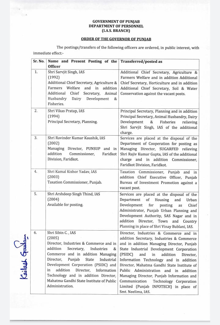 ਤਬਾਦਲਿਆਂ ਦੀ ਸੂਚੀ ‘ਚ ਸੂਬੇ ਦੇ ਉੱਚ ਪ੍ਰਸ਼ਾਸਨਿਕ ਅਧਿਕਾਰੀਆਂ ਦੇ ਨਾਲ-ਨਾਲ ਕਈ ਜ਼ਿਲ੍ਹਿਆਂ ਦੇ ਅਧਿਕਾਰੀਆਂ ਦੇ ਨਾਂ ਵੀ ਹਨ। ਕਈ ਅਧਿਕਾਰੀਆਂ ਨੂੰ ਵਾਧੂ ਜ਼ਿੰਮੇਵਾਰੀਆਂ ਵੀ ਦਿੱਤੀਆਂ ਗਈਆਂ ਹਨ। ਸੂਬਾ ਸਰਕਾਰ ਨੇ 1992 ਬੈਚ ਦੇ ਆਈਏਐਸ ਸਰਵਜੀਤ ਸਿੰਘ ਨੂੰ ਵਧੀਕ ਮੁੱਖ ਸਕੱਤਰ, ਖੇਤੀਬਾੜੀ ਅਤੇ ਕਿਸਾਨ ਭਲਾਈ ਵਿਭਾਗ ਦੇ ਨਾਲ-ਨਾਲ ਬਾਗਬਾਨੀ, ਭੂਮੀ ਤੇ ਜਲ ਸੰਭਾਲ ਵਿਭਾਗ ਦਾ ਵਾਧੂ ਚਾਰਜ ਦਿੱਤਾ ਹੈ।