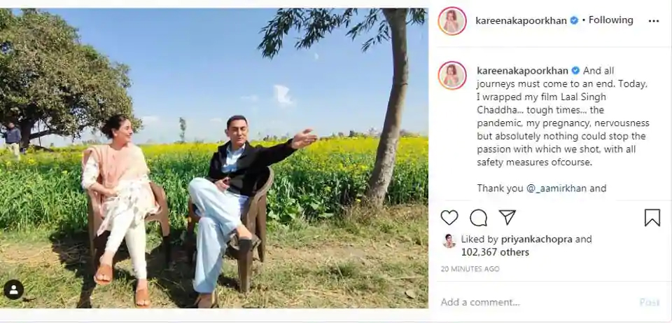 Kareena Kapoor has shared a beautiful picture with Aamir Khan as she wrapped up shooting for her portion for their upcoming film, Laal Singh Chaddha. The actor, who is more than five months pregnant with her second child, is seen chatting with Aamir amid the lush green fields.